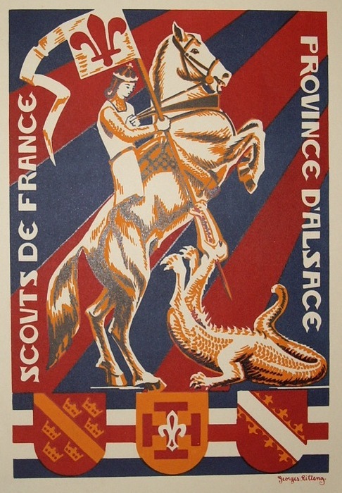 Avril 1932, c’est un dessin de Ritleng qui illustre la couverture de la revue « Scout de France » par un « Saint George » terrassant le dragon et paré de croix scoutes.