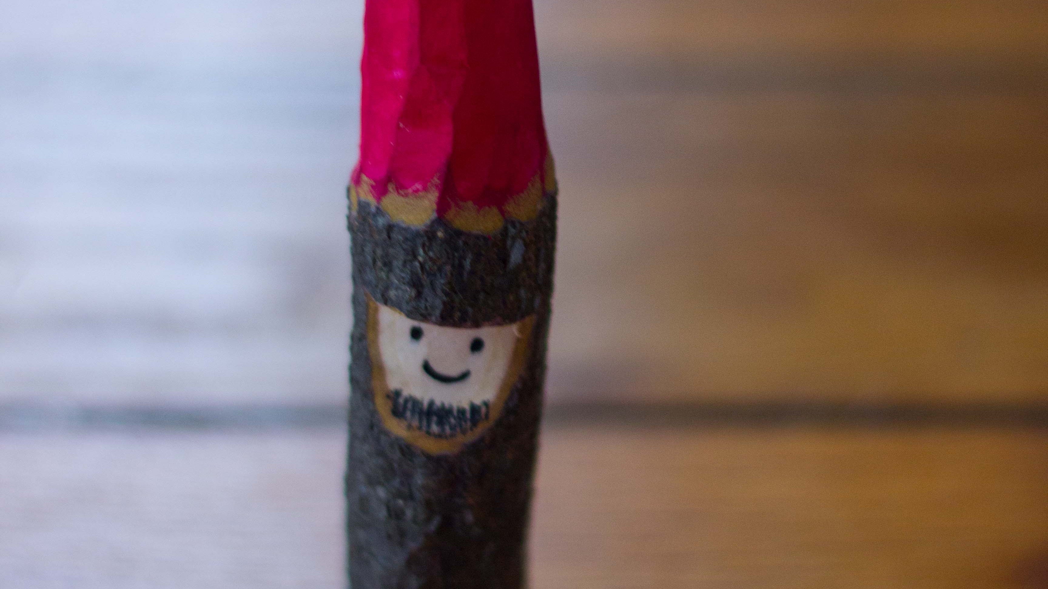 Taille ton bout de bois en pointe sur un tiers/la moitié de sa taille comme ci-dessous. tu peux lui donner des formes un peu arrondies. Il s’agira du chapeau de votre lutin?.