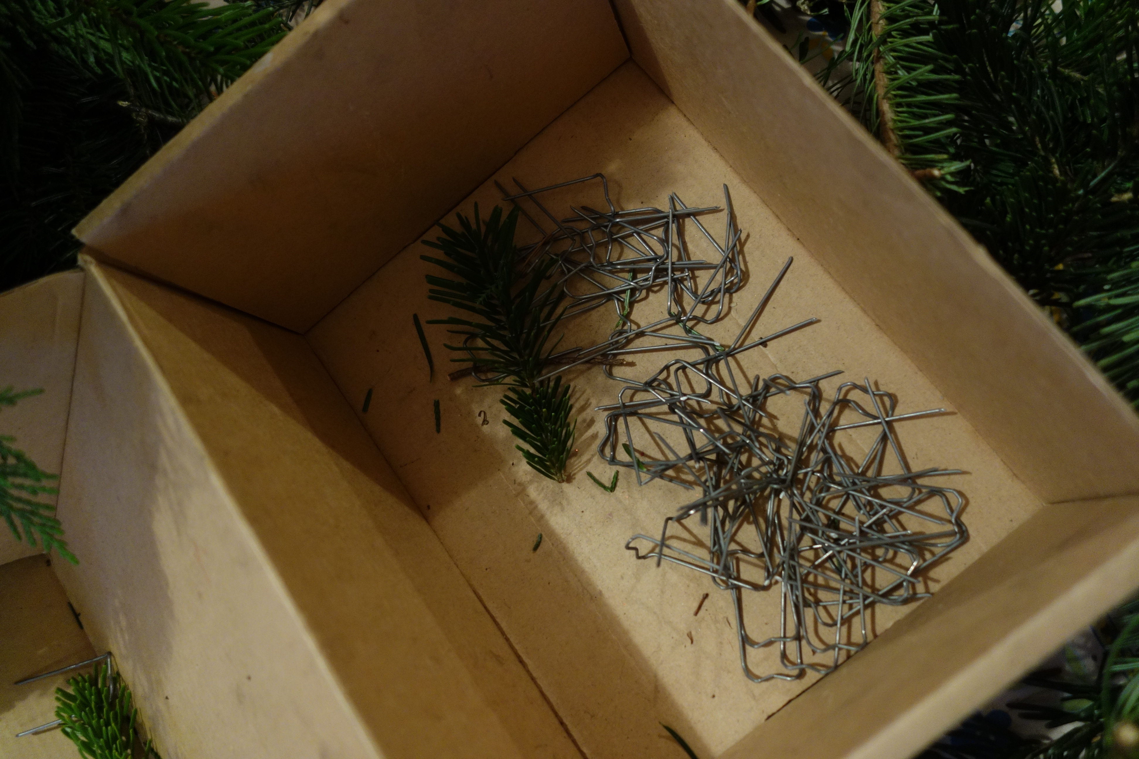 - Les piques (fleuriste ), en métal, avec lesquels on pique le sapin dans la couronne. On peut entourer la couronne de fil de fer (fin et vert ) pour maintenir le sapin sur le support.