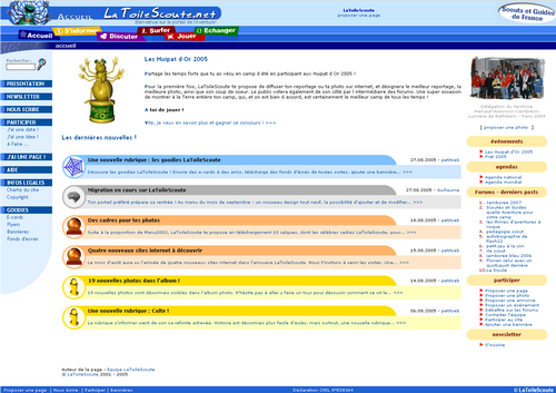 Lors de l’Assemblée Générale, on réalise que trois ans, pour un design, c’est long, c’est très long. Il a besoin d’un bon coup de pinceau pour correspondre plus au standard du web d’alors. Quelques jours après l’assemblée générale, Delphine propose un premier design. Peu à peu, l’équipe prend conscience que ce qui ne devait être qu’un coup de pinceau, une Version 2.5 de LaToileScoute devra en réalité être une refonte en profondeur de l’érgonomie et du design du site, une véritable Version 3.
