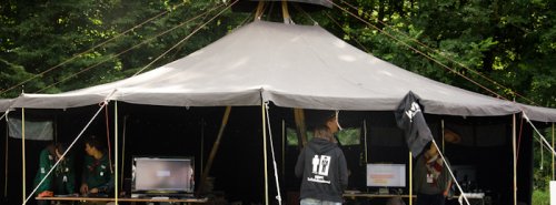 La veillée se déroule tranquillement, veillée folle, ambiance folle. On voit des éclairs d’orage au loin. Mouais, méfions-nous. La pluie tombe. Nous voyons que des poches d’eau se forment sur le toit de la yourte. Tandis que les uns vident régulièrement les poches, nous plions tout le matériel électrique à grande vitesse. Et appelons nos amis de la sécu pour venir chercher le matériel encombrant qui craint le plus pour le protéger dans le château : un PC, une télé grand écran et un grand écran Apple. Bon, ils se moquent un peu, mais c’est de bonne guerre :) Le reste du matériel est confiné dans des Shelter Box, de notre voisin partenaire des Scouts et Guides de France.