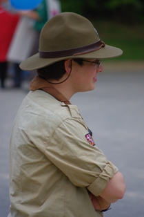 Nous l’interrongeons ensuite sur le 4 bosses qu’il porte [2], et que plusieurs participants portent aussi. Il nous répond que le 4 bosses est le couvre-chef des SUF?, et le bérêt celui des Europes et donc qu’il ne voit pas l’utilité pour les SGdF? de se doter d’un chapeau. Il trouve que G2D et la Journée de la Fraternité sont un bon rassemblement, en cohérence avec les objectifs du mouvement, différents de ceux de la FSE?. Son message à ses éclaireurs est court et simple : "A cet été !". Nous l’interrogeons sur ce qui l’amène à G2D : il est là en tant que "pote" d’un chef SGdF qu’il avait invité à Vezelay, c’est donc un juste retour d’ascenseur. Enfin, la réponse fuse lorsque nous lui demandons en quoi il est une graine de diversité :