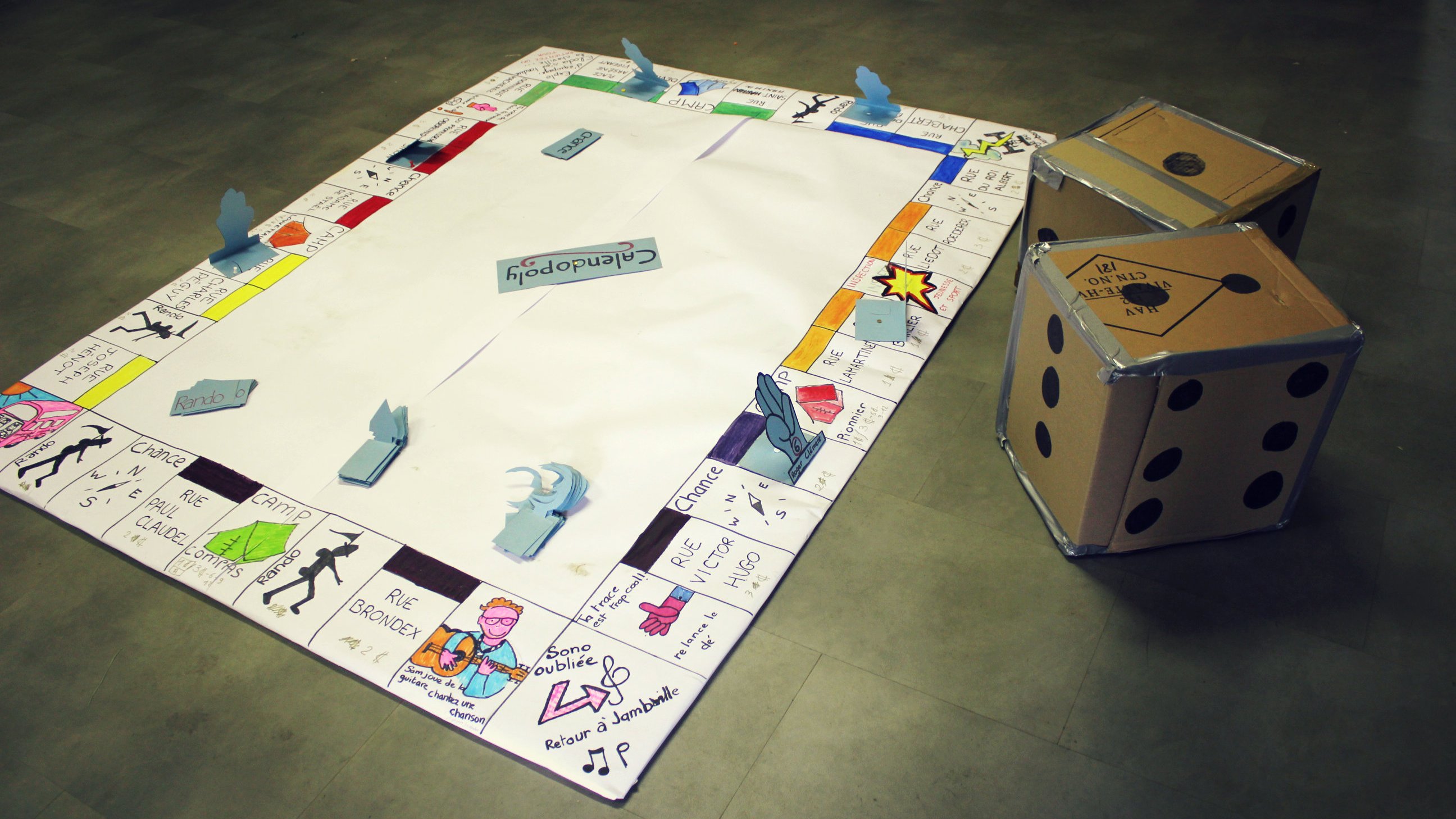 Une fois les transactions faites, l’équipe peut relancer le dé pour aller à un autre endroit. Si elle tombe sur une rue déjà occupée par une tente ou une nuit à la belle, elle paye l’équivalent de deux cartes ou un calendrier.