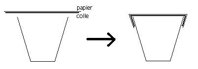 On passe après à l’assemblage (inspire-toi du schéma à droite) : prends un carré de papier, badigeonne-le généreusement avec de la colle sur une face et une face seulement. Pose-le sur le pot, face encollée dessous et tends au maximum le papier en prenant soin de bien le replier sur les bords du pot. Il se peut que le papier se déchire : ce n’est pas grave, recommence avec une autre feuille, en veillant toujours à bien tendre le papier. Quand cette première opération est achevée, répète-là deux fois. En principe, trois couches suffiront, sauf dans le cas où le diamètre en haut du pot est supérieur à 20 cm (il faut alors compter une ou deux couches supplémentaires). Tu peux en mettre plus, mais ce n’est pas nécessaire : plus tu mettras du papier, plus le son sera atténué.