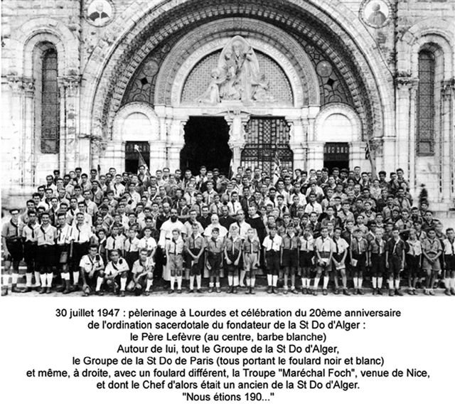 Une revue interne au Groupe est éditée. Elle s’appelle "FEUX". Elle n’a pas cessé d’être éditée. À Pâques 2007 a été publié le numéro 342 de la 71ème année.... À raison de 4 sizaines par Meute, de 4 à 5 patrouilles (de 6 à 8 éclaireurs chacune) par Troupe, le Groupe St Dominique est puissant : 80 louveteaux? et cheftaines, une centaine d’éclaireurs et de chefs. Cette photo de 1947 montre les Clans de la St Do d’Alger et de la St Do de Paris en pèlerinage commun à Lourdes.