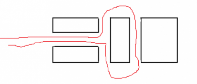 2. Percer chaque bâton de la même manière afin de pouvoir faire passer la ficelle à l’intérieur selon ce splendide schéma vu en coupe (attention à ne pas éclater le bois en faisant ça) :