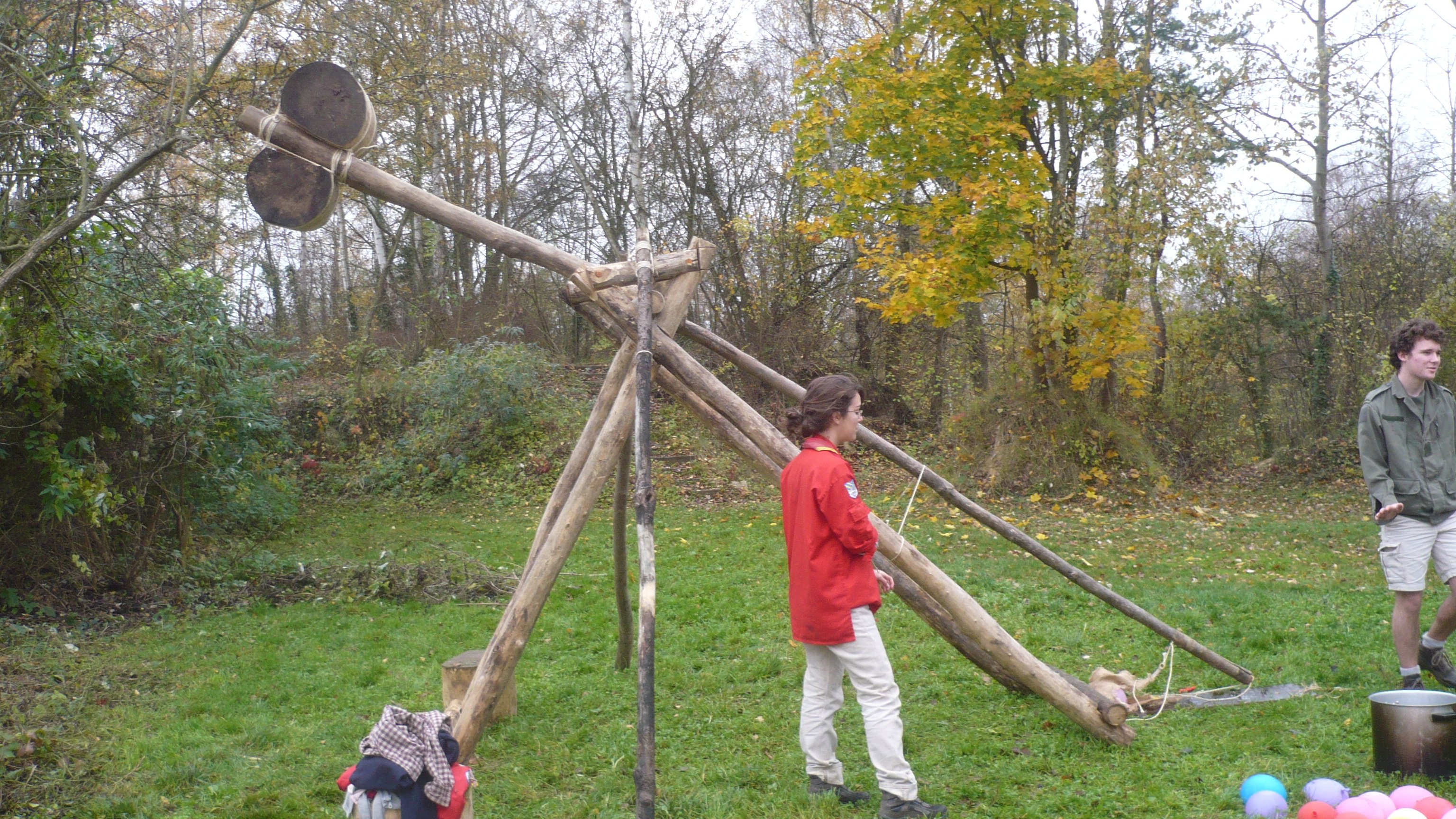 Construis les deux tripodes qui maintiendront le lanceur qui est composé d’un côté de poids (des énormes rondins font l’affaire) et de l’autre du lanceur en toile de jute. Une corde maintient le lanceur pour éviter que quelqu’un ne se blesse, il est également fortement conseillé de mettre une planche sous le sac pour qu’il glisse mieux au largage !