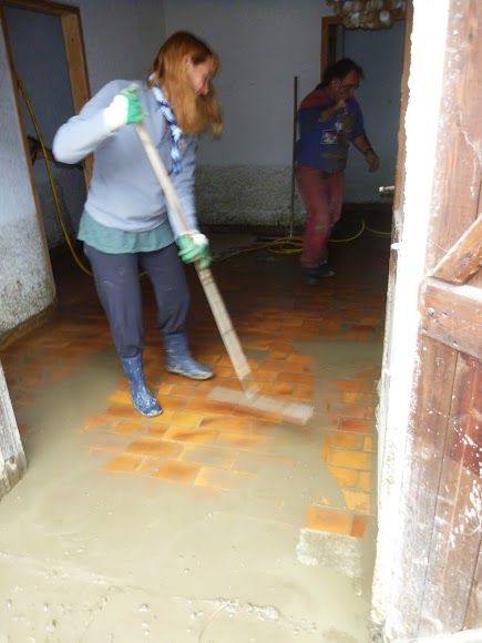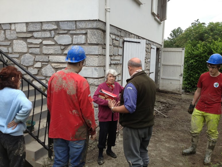 Arrivés sur place, nous sommes dirigés vers le presbytère et des particuliers dont les caves sont envahies de boue. L’eau est montée à plus de deux mètres de haut dans les maisons et nous avons aidé à vider chaque garage et à sortir la boue.