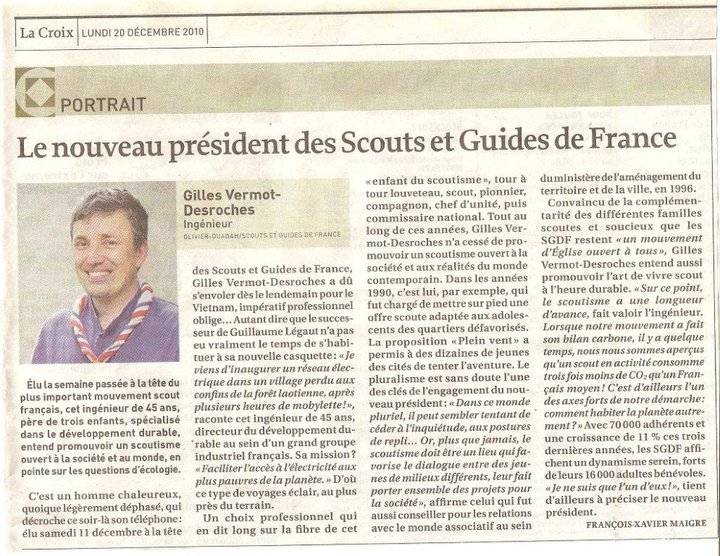 Convaincu de la complémentarité des différentes familles scoutes et soucieux que les SGDF? restent un "mouvement d’Eglise ouvert à tous", Gilles Vermot-Desroches entend aussi promouvoir l’art de vivre scout à l’heure durable. "Sur ce point, le scoutisme a une longueur d’avance, fait valoir l’ingénieur. Lorsque notre mouvement a fait son bilan carbone, il y a quelques temps, nous nous sommes aperçus qu’un scout consomme trois fois moins de CO2 qu’un français moyen ! C’est d’ailleurs l’un des axes forts de notre démarche : comment habiter la planète autrement ?" Avec 70 000 adhérents et une croissance de 11% en trois ans, les SGDF affichent un dynamisme serein, forts de leurs 16 000 adultes bénévoles. "Je ne suis que l’un d’eux !" tient d’ailleurs à préciser le nouveau président. »