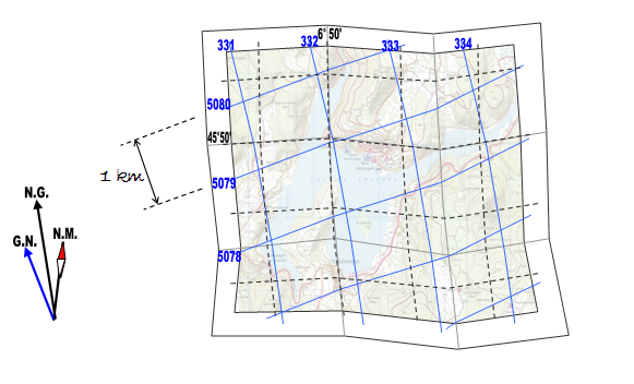 Les cartes IGN récentes [1] sont munis d’un quadrillage particulier (le quadrillage UTM) qui correspond à un découpage particulier de la Terre. Le nord du quadrillage est la direction des lignes de ce dernier (en allant vers le haut de la carte). Le Nord du quadrillage est parfois noté G.N. Pour Grid North.