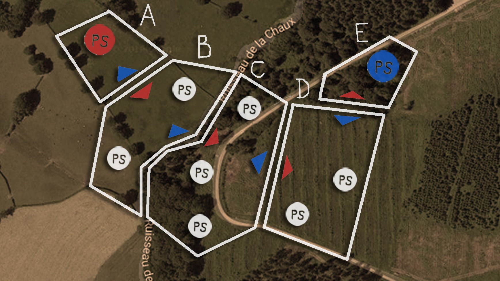 Idéalement, le terrain est varié, entre bois et plaine, relief et plat. Mais il peut également se jouer en version “allégée” sur un terrain de football. L’essentiel est de pouvoir placer des zones Points Stratégiques (PS) sur les 5 secteurs, comme sur les exemples ci-contre.