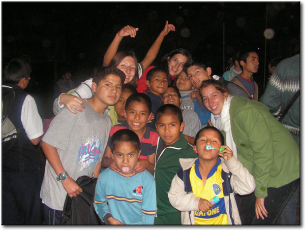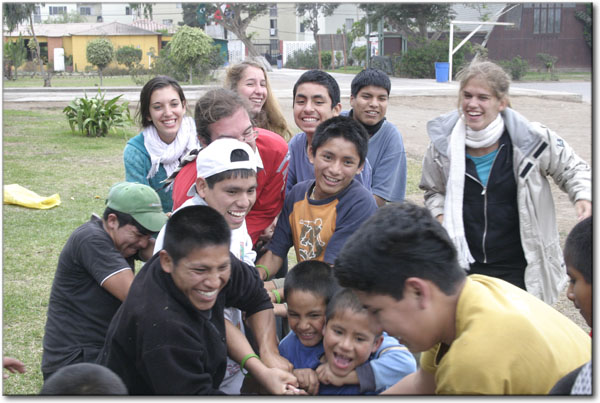A Lima, nous sommes allés directement à l’association « Hogar de Cristo », accompagnés du psychologue du centre qui est venu nous chercher à la gare routière. Cette association s’occupe de recueillir les enfants des rues ainsi que les personnes âgées rejetées et les handicapés mentaux. Après avoir fait une réunion avec le directeur du centre, les éducateurs et les psychologues, réunion durant laquelle nous avons pu fixer clairement le programme de nos activités, nous nous sommes installés (l’association nous a gracieusement mis à disposition toute une partie de bâtiment avec bureau, douche et chambres). Durant la réunion, nous avons découvert qu’il n’y avait que des garçons dans cet établissement, les filles se trouvant à Chosica, dans une ville à deux heures de Lima.
