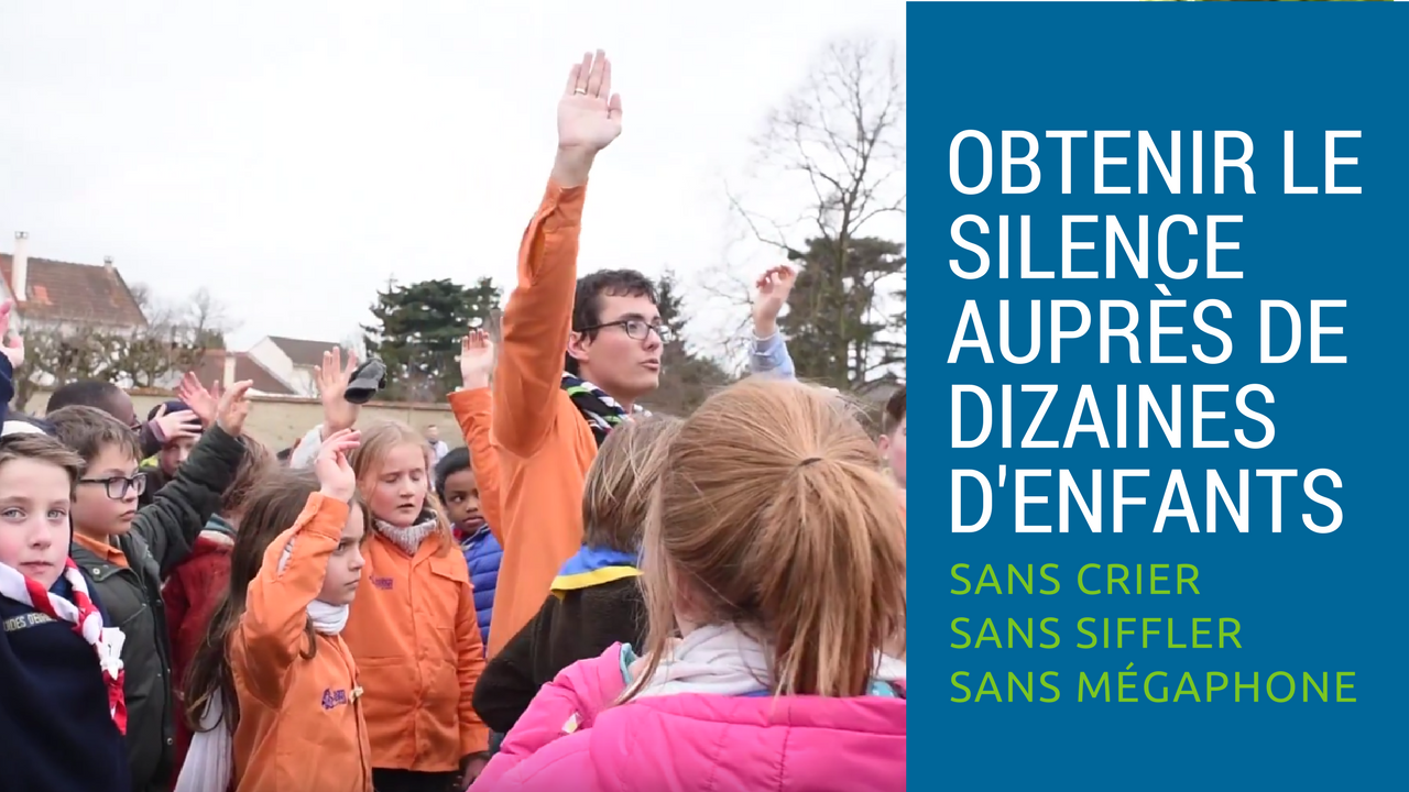 Il suffit d’établir cette règle : quand une personne lève la main, ou réunit ses mains au-dessus de sa tête, tout le monde doit faire de même, et ce faisant, faire silence.