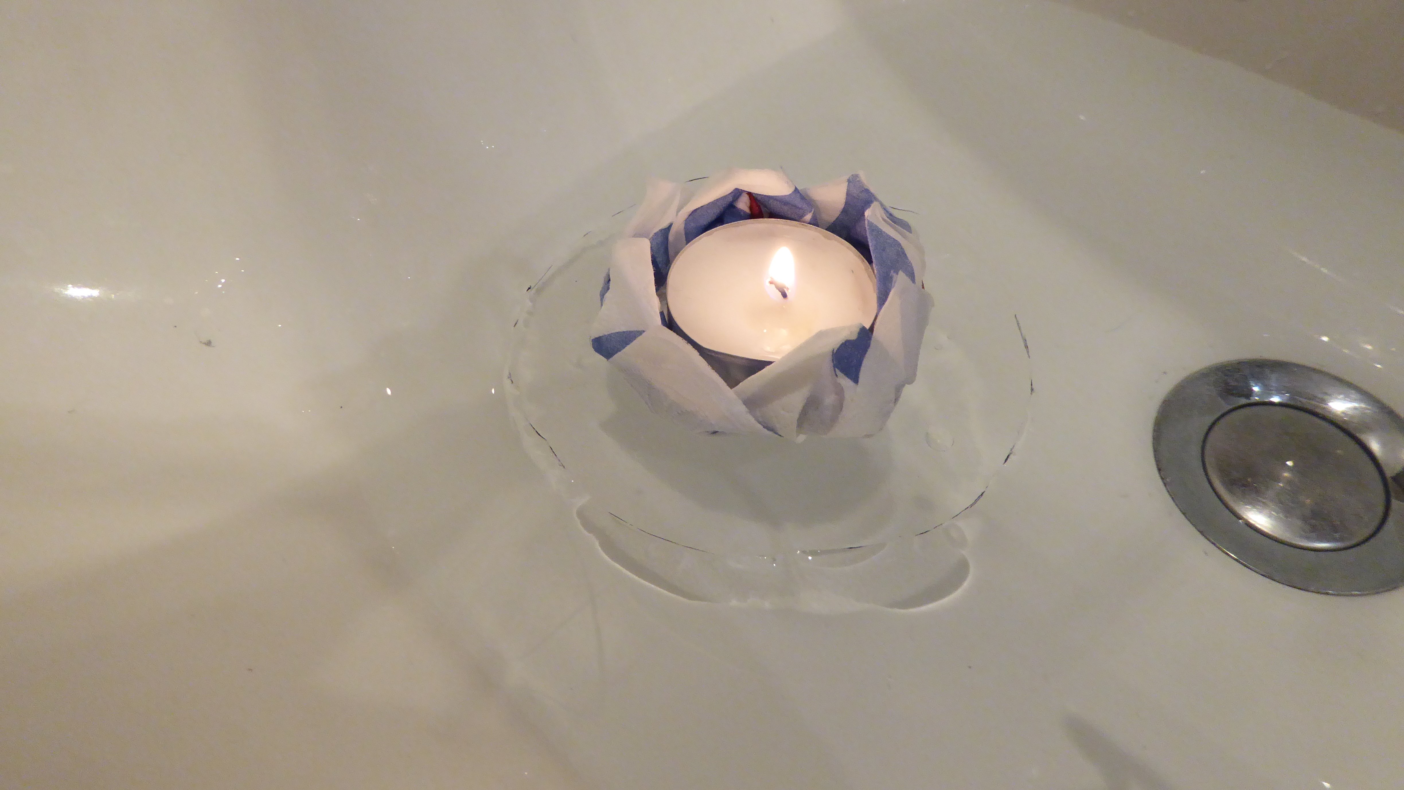 Remplis une bassine d’eau et dépose le nénuphar, pétales vers le haut puis regarde le se déplier sur l’eau.