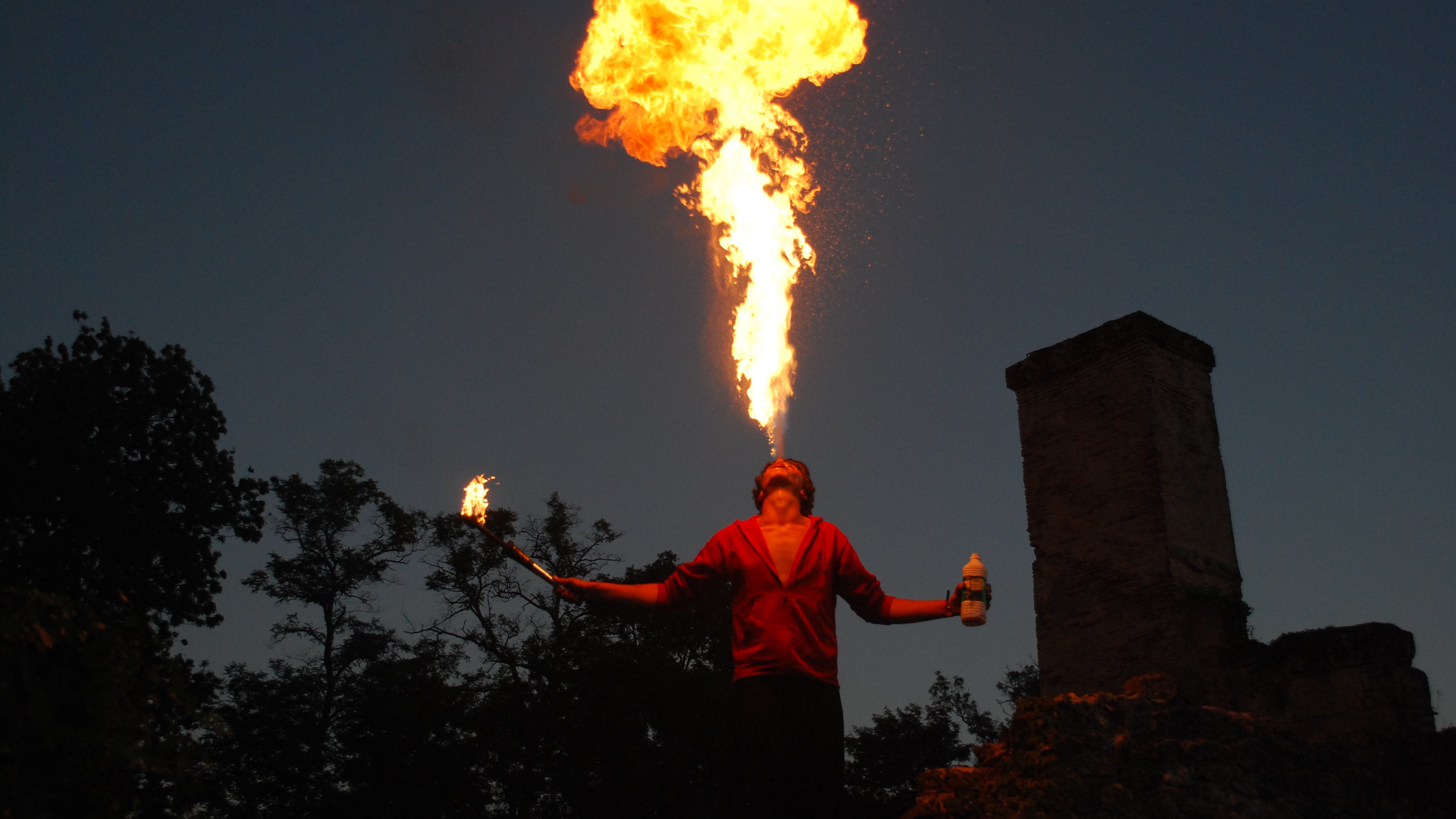 Lorsque quelqu’un crache du feu, la flamme est en deux parties. Une fine, de liquide enflammé, et au bout une sorte de boule de feu très large.