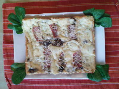 250 g de farine, levure du boulanger (3g si tu prends de la levure fraîche, ou 1/2 sachet si tu prends de la levure sèche), ½ verre d’huile, ¾ d’un bol de lait tiède, tomates pelées, oignons, champignons, jambon braisé, lardons, gruyère râpé, morceaux de Saint-Nectaire, sel et poivre.
