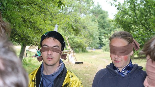 Les joueurs se mettent par paires. Les joueurs se placent dos à dos et se lient par les bras à l’aide de foulards. Les équipes ainsi formées s’alignent au centre de la pièce (si le jeu est à l’intérieur). Au départ donné par le meneur de jeu, chaque équipe essaie d’atteindre un point donné sans se détacher. Si le duo se délie, les deux ont perdus.