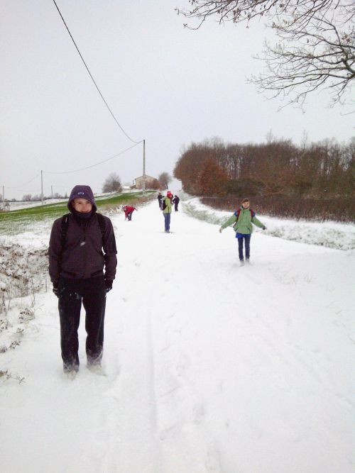Mais rentrer à pieds, quand c’est sur une route enneigée, cela prend du temps. Oh non pas qu’il soit compliqué de marcher, non ! Mais la neige est suffisamment amusante pour glisser, se lancer des boules, etc ! Encore des souvenirs pleins la tête.
