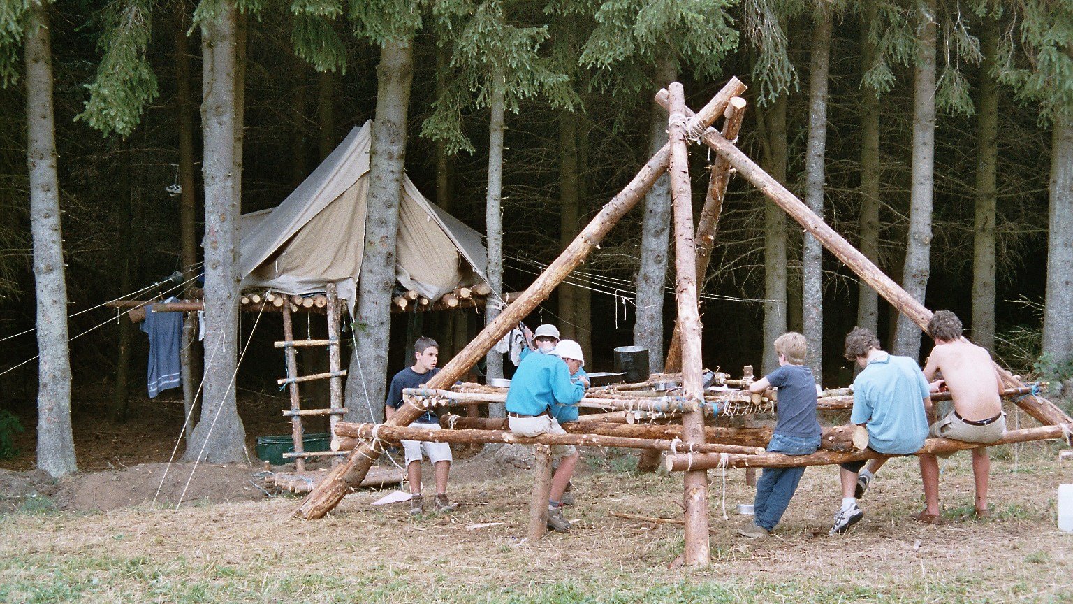 Le premier niveau de perches, qui constitue les bancs est fixé par des brelages à l’extérieur du tripode. Il faut le placer à hauteur, pour que tu puisse t’asseoir dessus (ainsi que le plus petit de la patrouille !) ce qui fait environ 45 cm du sol.