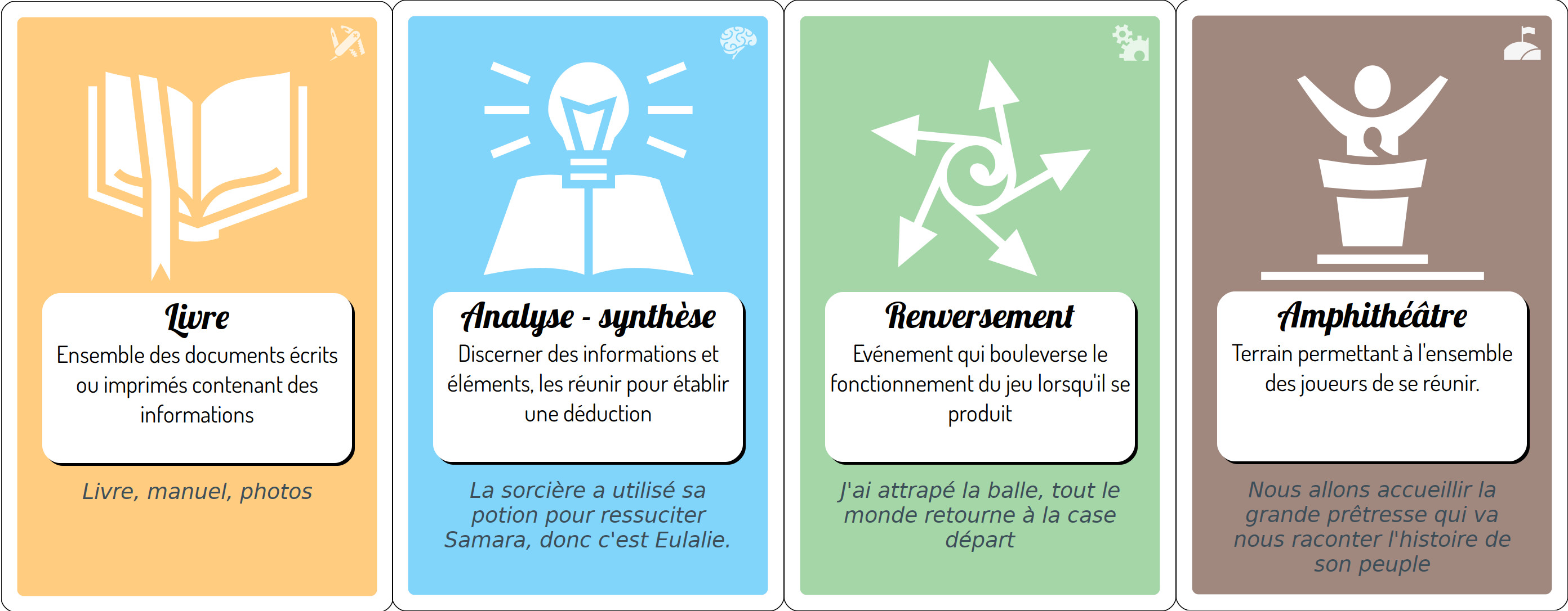 - Compétences (15 cartes) : Les compétences utilisées par les participants durant le jeu.