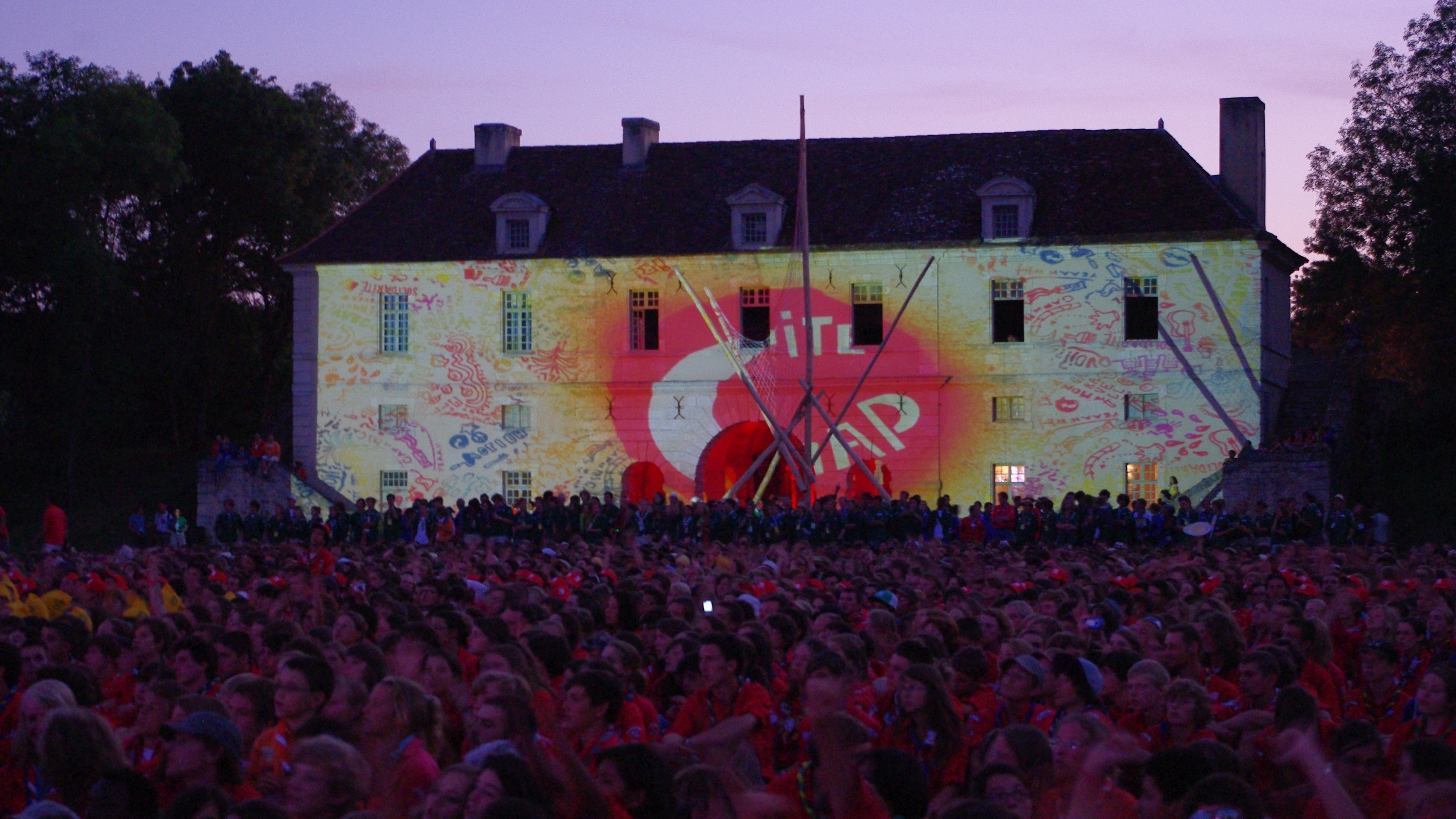 A l’occasion de la première veillée du rassemblement, les pionniers et caravelles ont passé pour la première fois le fort, derrière lequel a été aménagé l’espace scénique. Un concert de "ouaaah..." et de "trop bôôôô !!!" répondait aux nombreux "ça déchire !" Il faut croire que le cadre du site en a scotché plus d’un... Alors qu’Amplitude mettait l’ambiance avec ses chants, il a bien fallu une bonne demi-heure pour que tout le monde s’installe : en effet, nous sommes très officiellement 10124 sur le site ! Si si, recomptes sur la photo, tu verras !