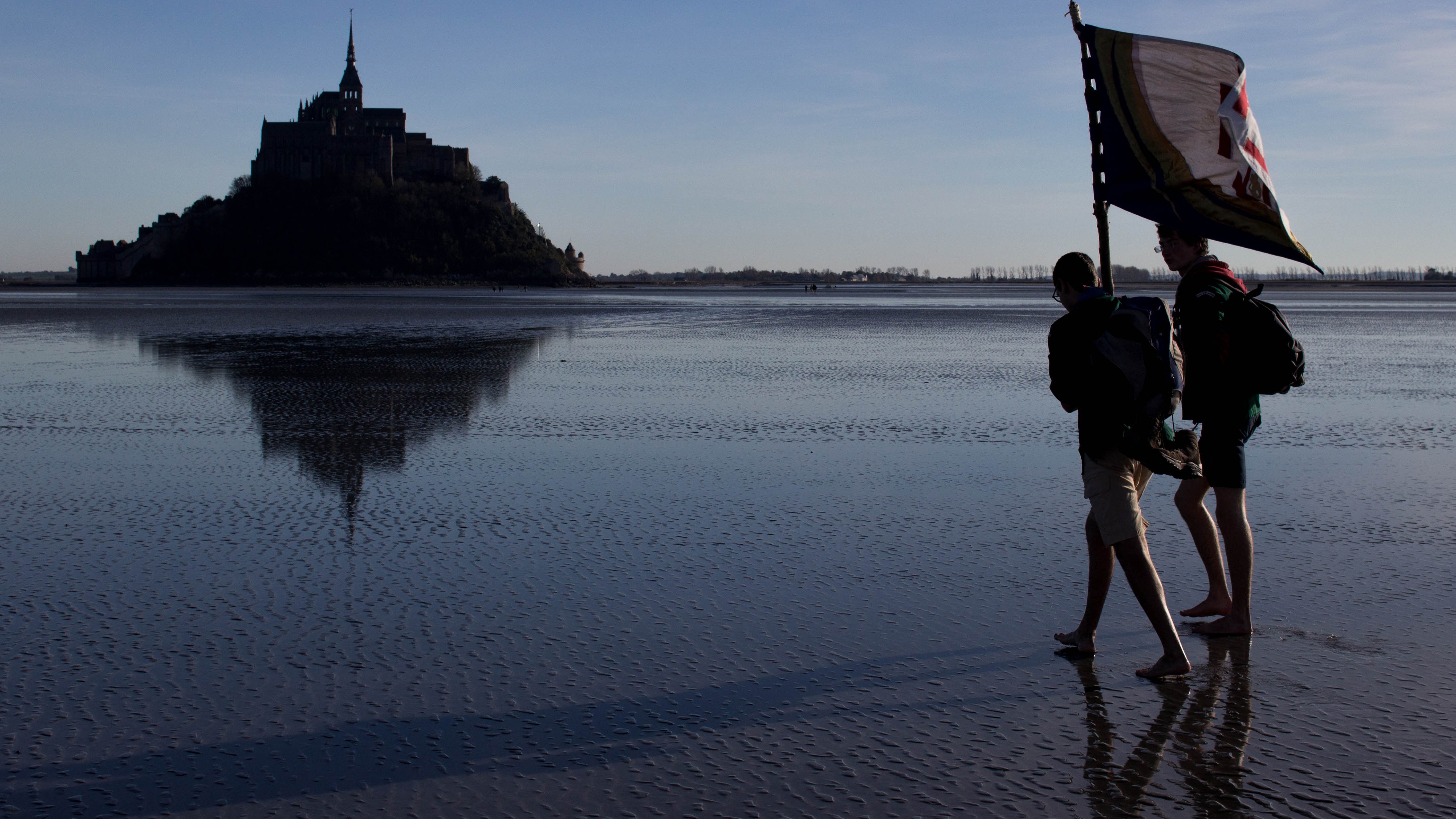 Entre sables mouvants, vase et eau à mi-cuisses, nous avançons tous en ligne, étendards et drapeaux levés. Nous nous lançons pour certains dans un temps festif de partage avec des inconnus, et pour d’autres dans un moment de spiritualité et de prière.