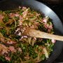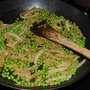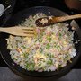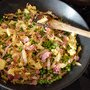 4. Dans la poêle, mets l’autre noix de beurre et fais revenir l’oignon épluché et coupé finement. Quand il est légèrement doré, ajoute le jambon coupé fin, l’omelette, les petits pois et le riz.