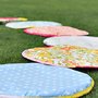 – Avec l’aide du patron, découpe 2 ronds de 60cm de diamètre dans la nappe, un pour chaque face.