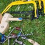 Tandis que l’an dernier, la tendance était à la maitrise de la roue et de la poulie, cette année, la tendance a été de maitriser les axes de rotations, et, plus que jamais, la triangulation qui permet à l’installation de tenir debout de manière stable. La contrainte est donnée : pas de clou, pas de trou ! Perches et ficelles, posées à même le sol.